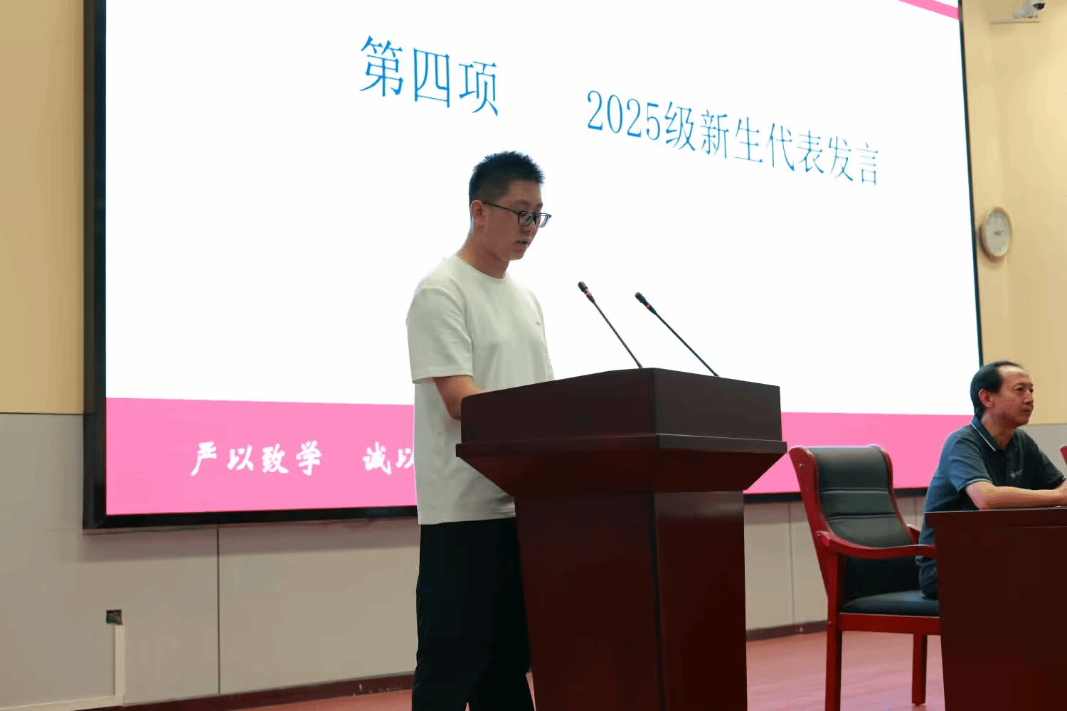新生代表吕金灿随后发言,他分享了收到录取通知书时的激动,以及了解学院学科成果后的向往。他承诺将以认真态度打好专业基础,主动参与学术实践与集体活动,既要潜心钻研知识,也要积极融入集体,用四年努力成长为有理想、有担当的数统学子,不辜负学院与家人的期待。