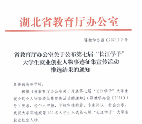 本网讯近日,湖北省教育厅印发通知,公布了第七届“长江学子”大学生就业创业人物事迹征集结果。我院2017届校友、西二文化传媒有限公司法人兼董事长袁琅,成功入选湖北省第七届“长江学子”大学生就业创业人物,是我校今年唯一获此荣誉学生。