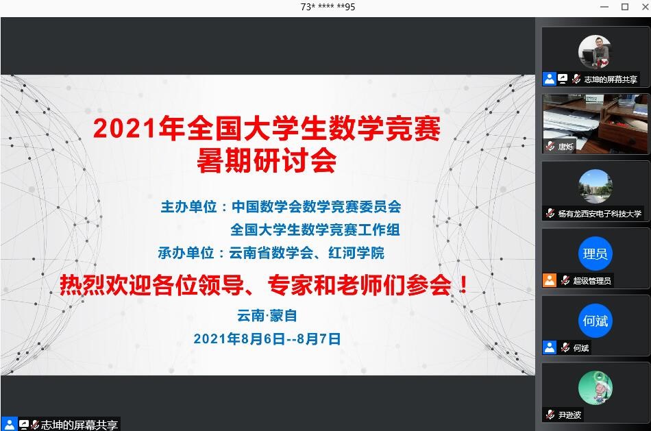 据悉,本次会议由中国数学会、教育部高等学校数学类专业教学指导委员会、教育部高等学校大学数学课程教学指导委员会和教育部高等学校统计类专业教学指导委员会联合指导,中国数学会数学竞赛委员会全国大学生数学竞赛工作组主办,云南省数学会和红河学院联合承办,原定2021年8月5日-8日在云南省红河州蒙自市召开,后考虑到国内新冠肺炎疫情防控形势,大会组委会决定取消举办线下会议并改为线上会议,同时会议时间调整为8月6日-7日。
