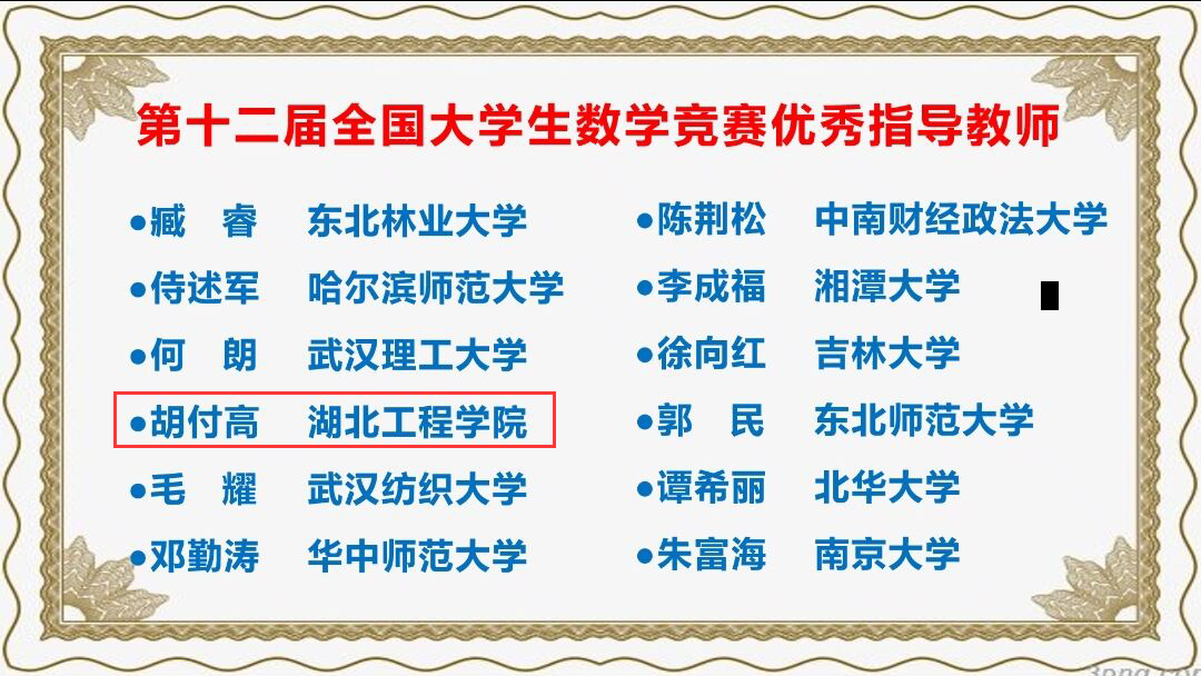 本网讯:近日,2021年全国大学生数学竞赛暑期研讨会通过线上形式召开,我校胡付高教授被评为“第十二届全国大学生数学竞赛优秀指导教师奖”。