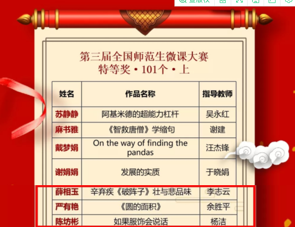 日前,从全国师范生微课大赛官方平台传来喜讯,我院选送的两件微课作品在第三届全国师范生微课大赛中全部获奖,其中0213011121班严有艳同学的作品《圆的面积》获特等奖(指导教师:余胜平)、0193011141班毛婉平同学作品《轴对称图形》获二等奖(指导教师:史杰),余胜平老师同时获评“优秀指导教师”。