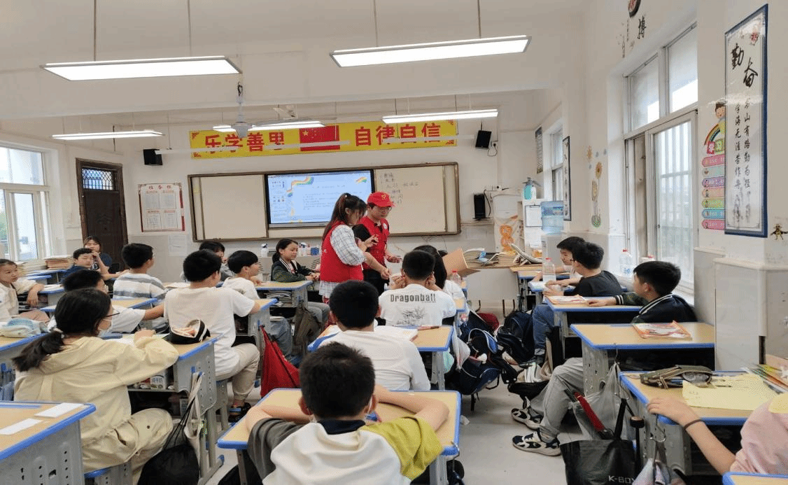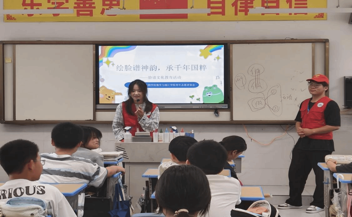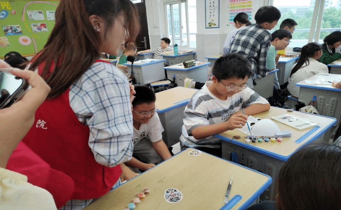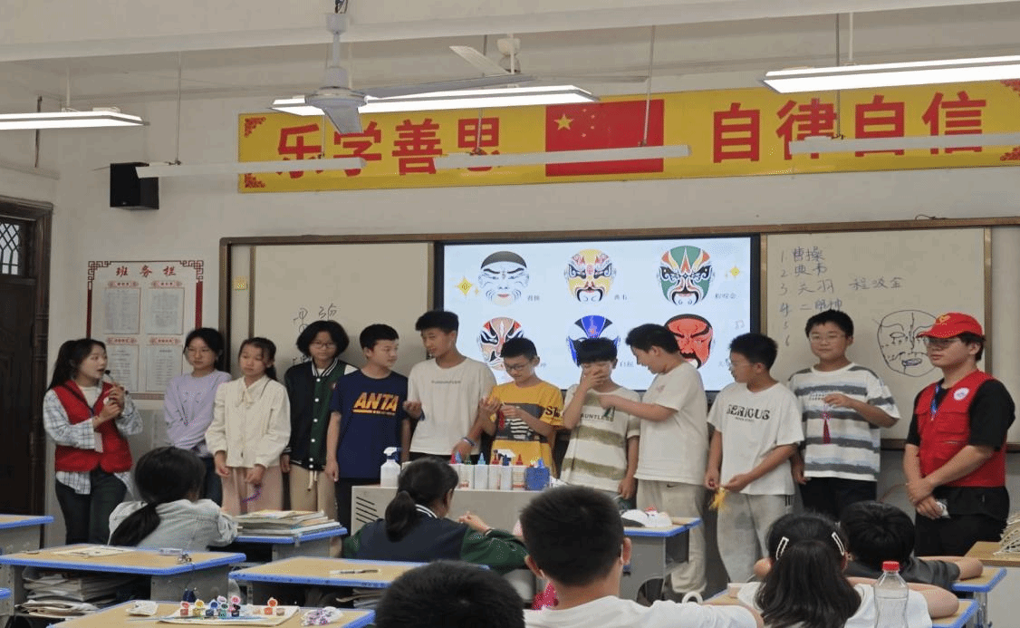 "关公的红脸代表忠义,包拯的黑额月牙象征清廉..."活动现场,曾获国家助学金的志愿者左同学正以"传统色彩密码"为主题,结合自身从受助到助人的成长经历,向孩子们讲解脸谱中的品德隐喻。学院组织12名受助学生经过专业培训后走进课堂,在文化传播中实现自我价值升华。