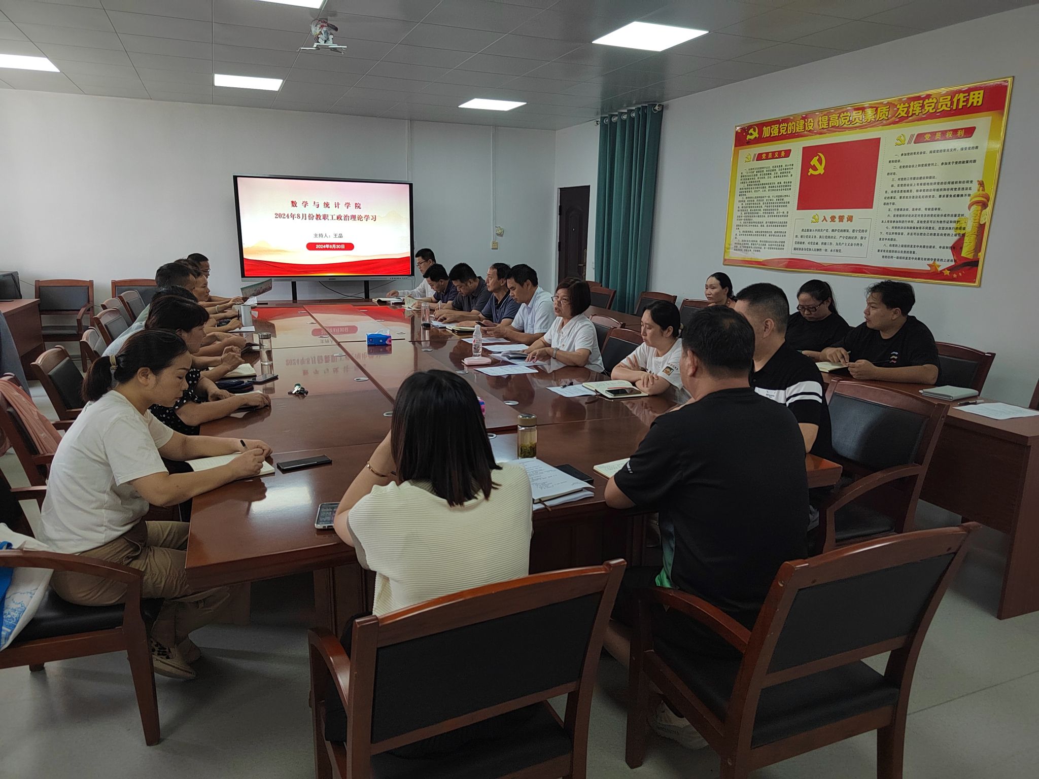 8月30日下午,数统学院在三楼会议室召开八月份教职工政治理论学习会议暨秋季第一次全体教职工大会,全体教职工参加,院党委书记王晶主持会议。