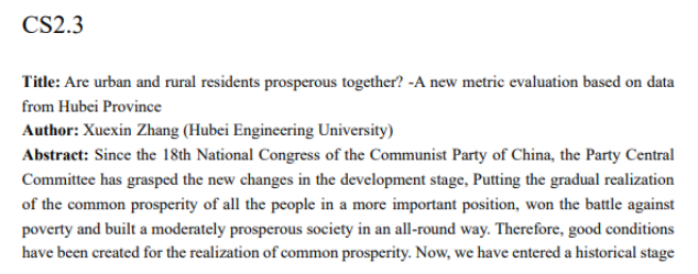 600多名国内外高校学者线上参与本次大会。Peking University陈松蹊院士及来自University of Alberta、University of Melbourne、University of Kansas等大学8名国内外知名学者专家做了大会报告。在概率组和统计组分会场报告中,有19位来自Peking University、Zhejiang University、Wuhan University、Lanzhou University、Sichuan University等高校的老师和同学做了学术报告。我校张学新教授在14日上午做题为“Are urban and rural residents prosperous together? -A new metric evaluation based on data from Hubei Province”学术报告。