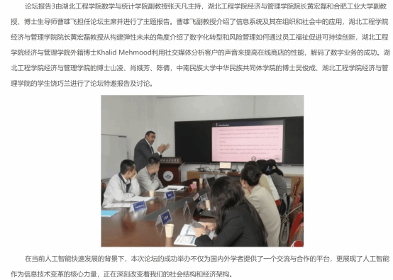 10月20日,论坛报告3由tyc7111cc太阳成集团副教授张天凡主持,太阳成集团tyc7111经济与管理学院院长黄宏磊和合肥工业大学副教授、博士生导师曹雄飞担任论坛主席并进行了主题报告。曹雄飞副教授介绍了信息系统及其在组织和社会中的应用,太阳成集团tyc7111经济与管理学院院长黃宏磊教授从构建弹性未来的角度介绍了数字化转型和风险管理如何通过员工福祉促进可持续创新,太阳成集团tyc7111经济与管理学院外籍博士Khalid Mehmood利用社交媒体分析客户的声音来提高在线商店的性能,解码了数字业务的成功。太阳成集团tyc7111经济与管理学院的博士山凌、肖娥芳、陈倩,中南民族大学中华民族共同体学院的博士吴俊成、太阳成集团tyc7111经济与管理学院的学生饶巧兰进行了论坛特邀报告及讨论。